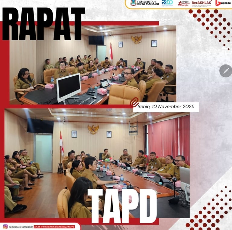 Senin, 10 November 2025 Kepala Badan Pendapatan Daerah Kota Manado Bpk. Jefry F.R. Mongdong, S.Sos., M.Si., CGCAE didampingi Kepala Bidanq Pelayanan Pajak dan Retribusi Bpk. Richard Sem Rorong, S.E., MSA, Ak., mengikuti rapat TAPD dalam rangka Pembahasan RKA Tahun Anggaran 2026 yang dipimpin oleh Sekretaris Daerah Kota Manado Bpk. Steaven Dandel, MPH.. dan diikuti para Pejabat PimpinanTinggi Pratama beserta jajaran terkait yang bertempat di ruang rapat BKAD.